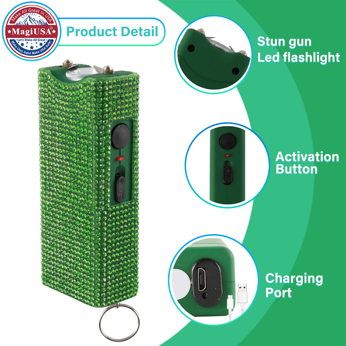 MagiUSA recently launched a new fashion collection of self-defense devices. The green bling-bling stun gun keychain set is designed for the daily use of vulnerable groups.