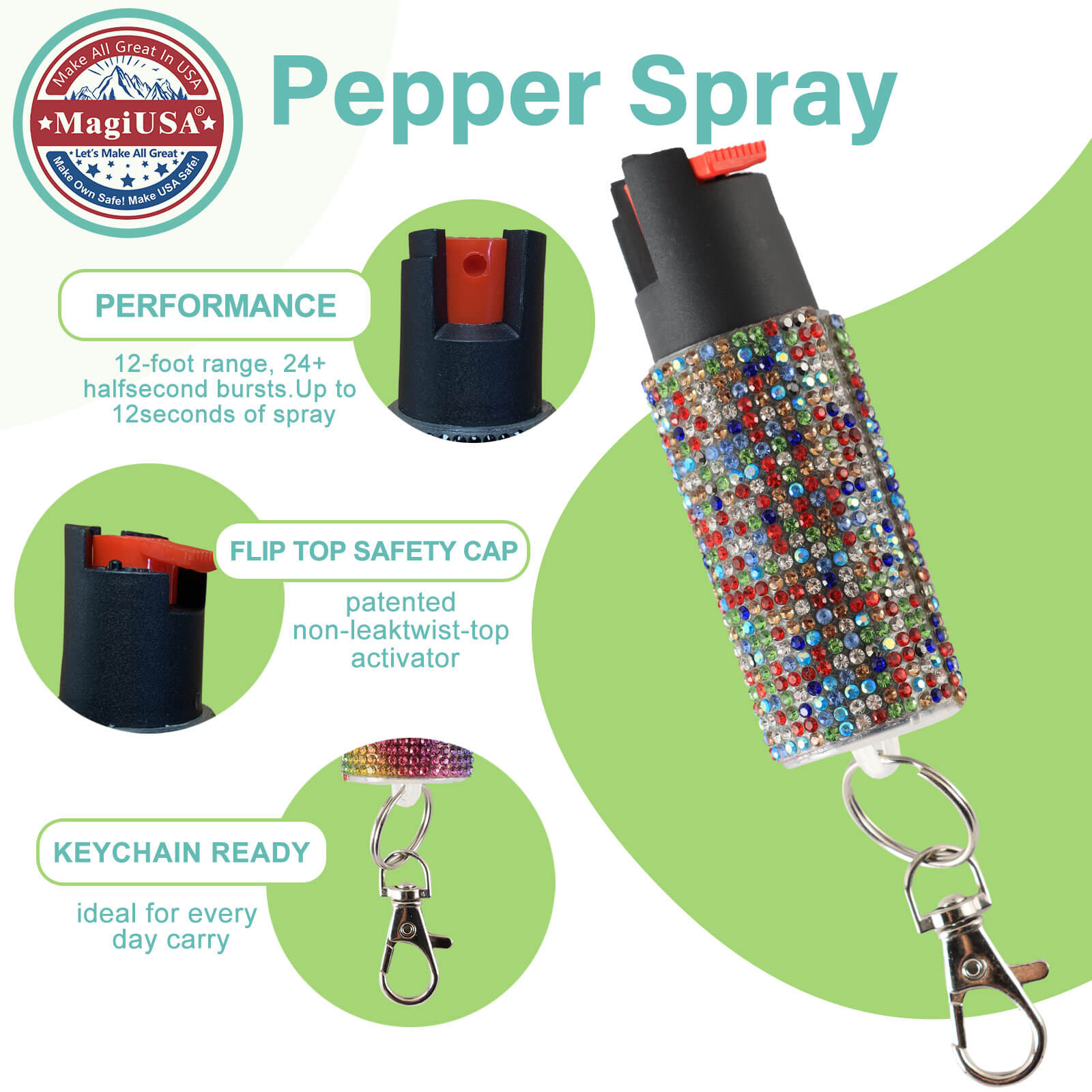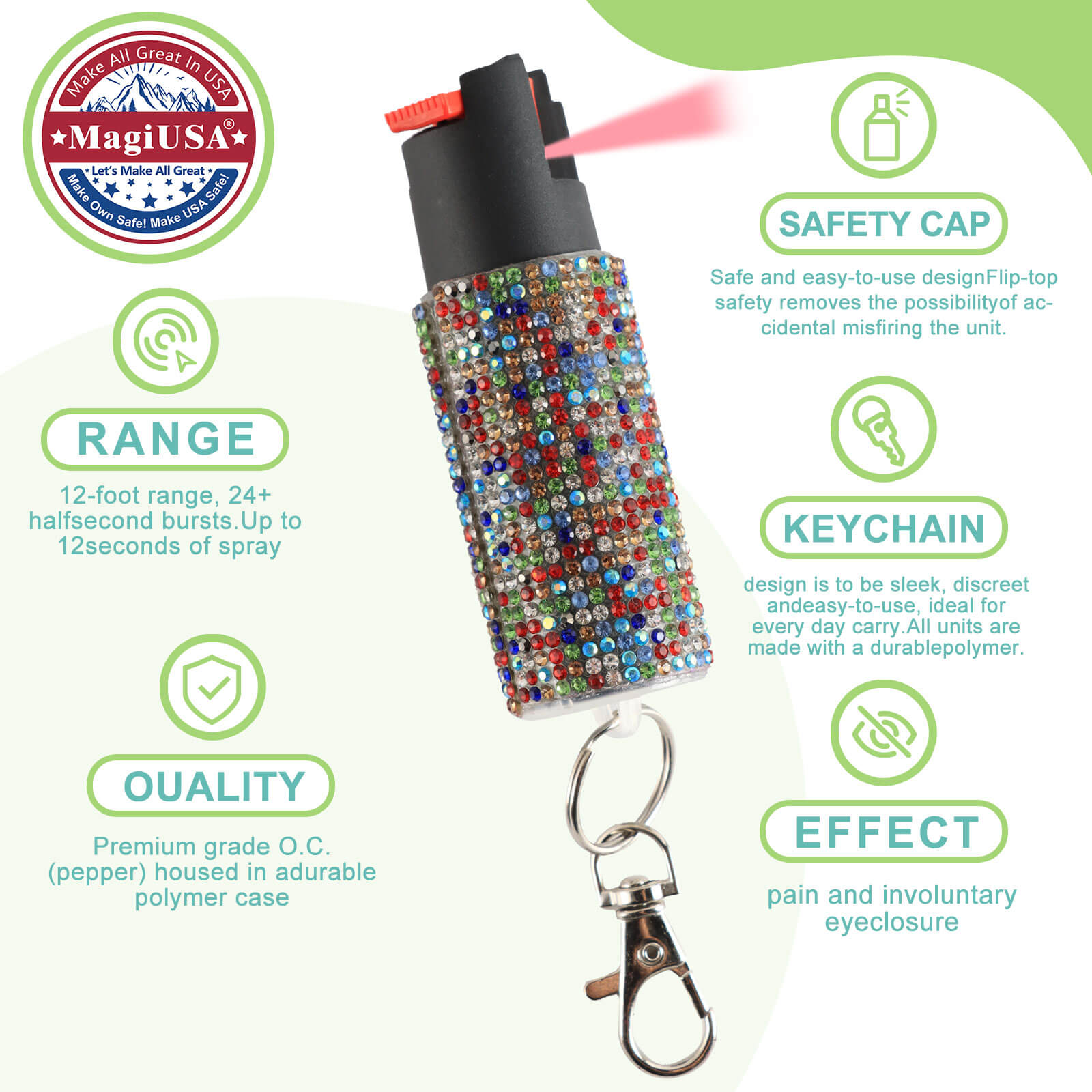 MagiUSA recently launched a new fashion collection of self-defense devices. The mosaic bling-bling pepper spray keychain set is designed for the daily use of vulnerable groups.