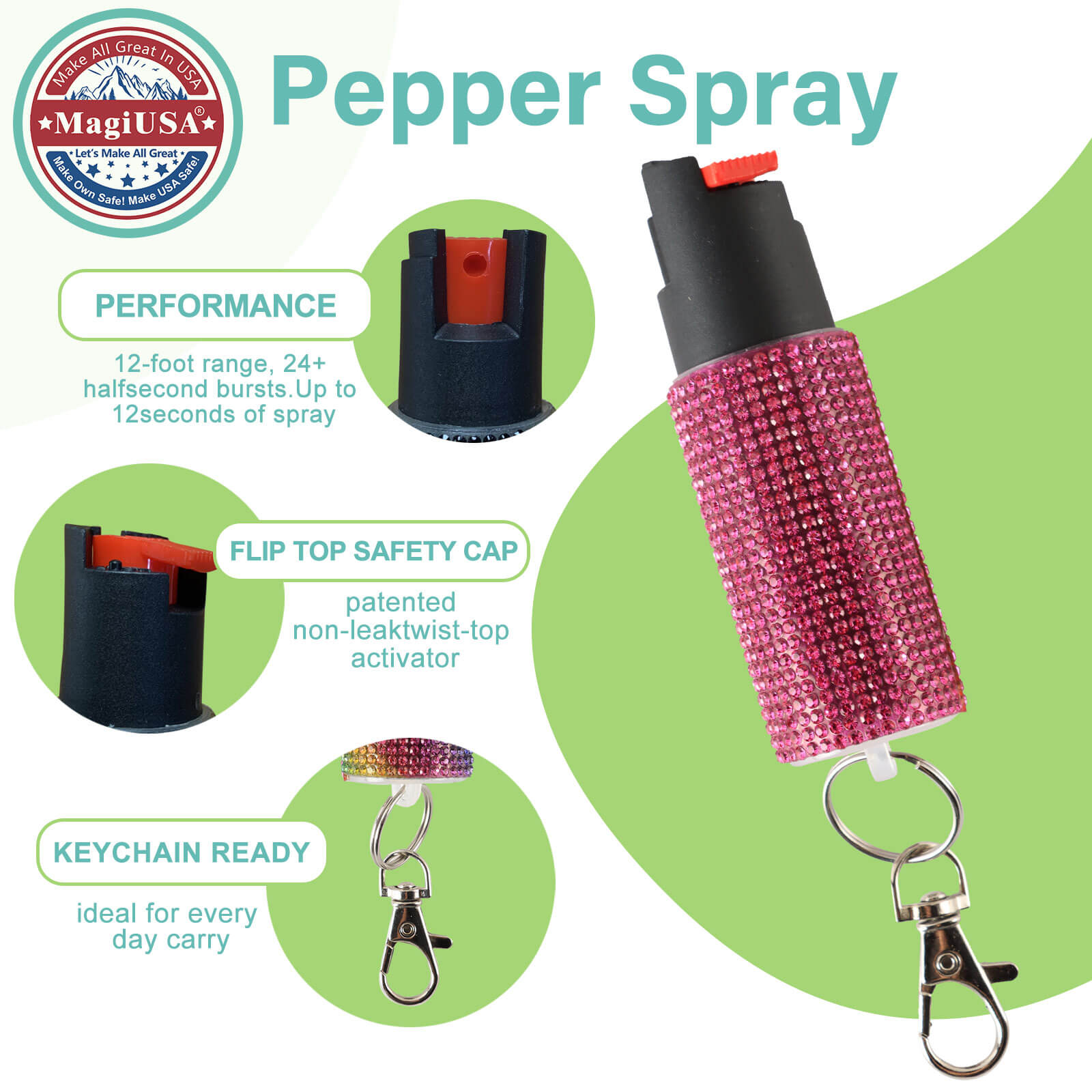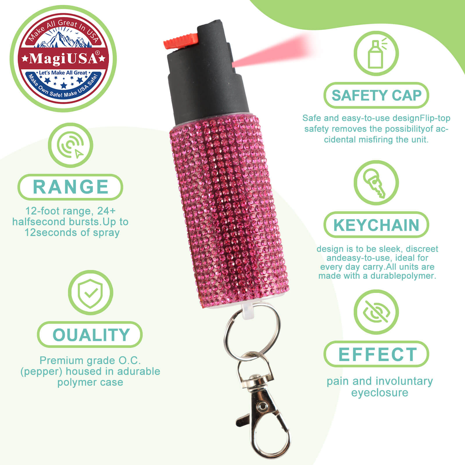 MagiUSA recently launched a new fashion collection of self-defense devices. The pink bling-bling pepper spray keychain set is designed for the daily use of vulnerable groups.