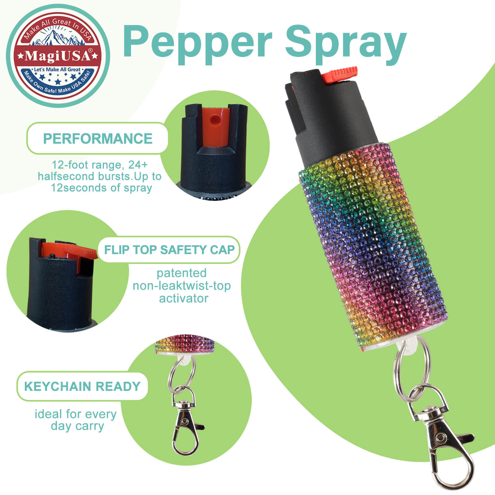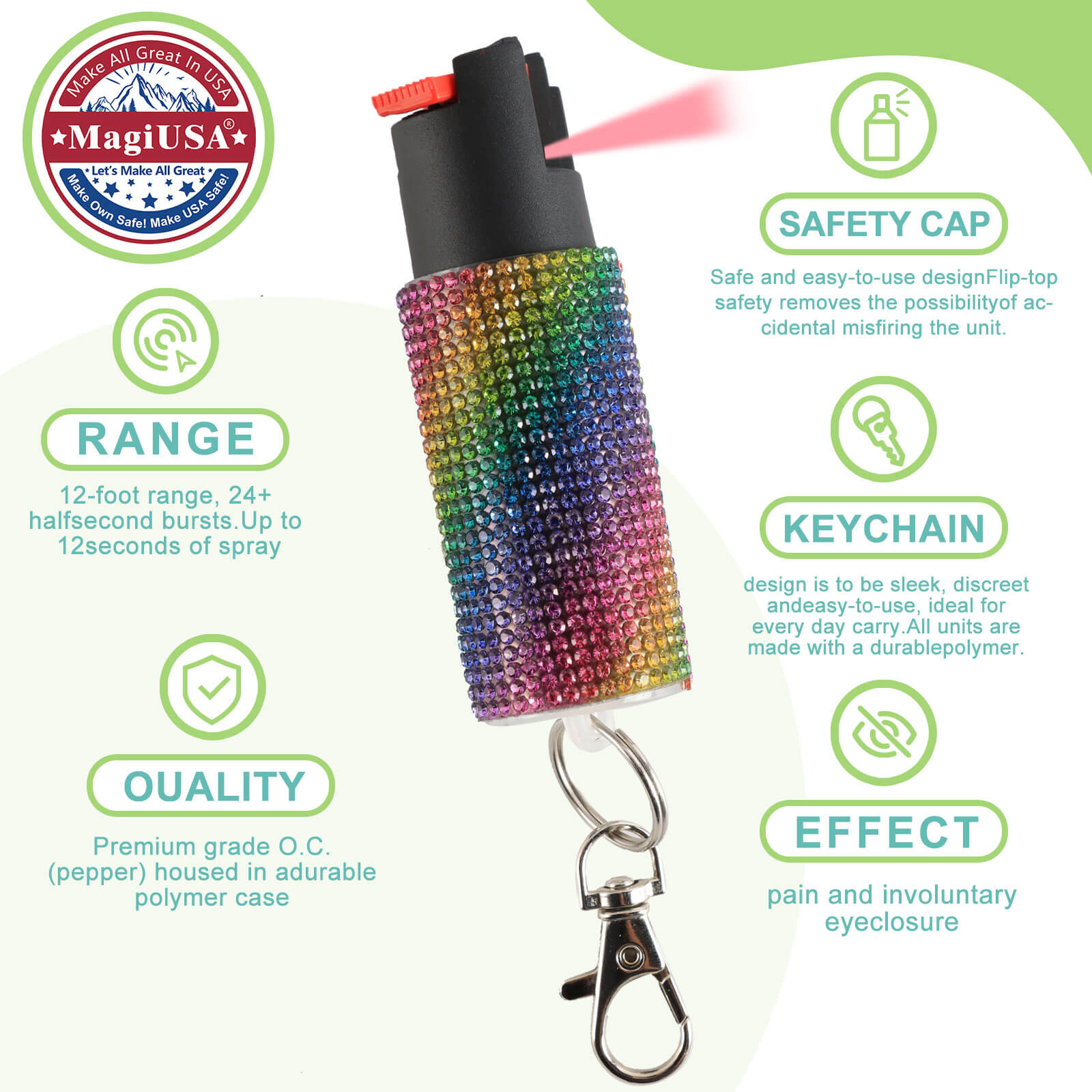 MagiUSA recently launched a new fashion collection of self-defense devices. The rainbow bling-bling pepper spray keychain set is designed for the daily use of vulnerable groups.