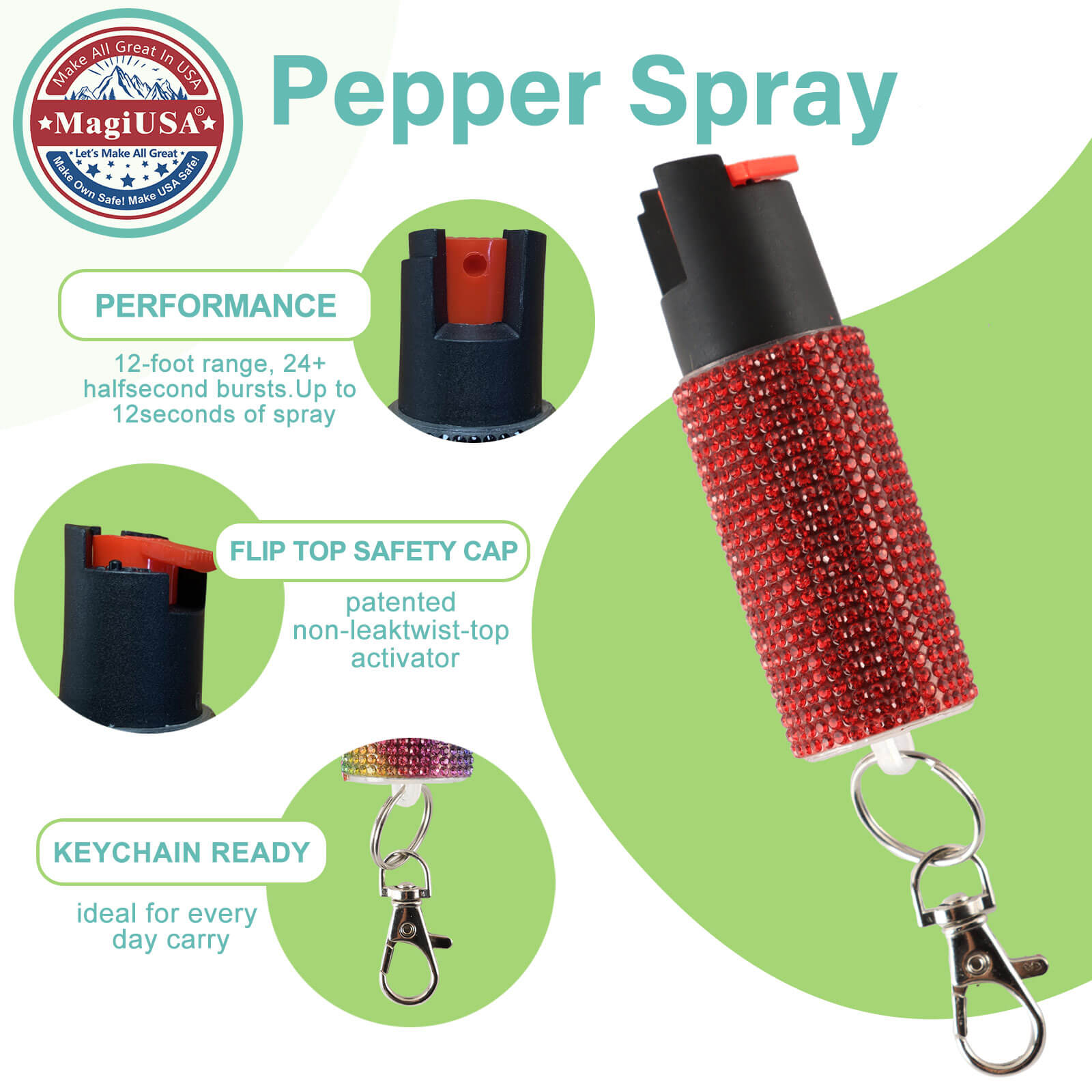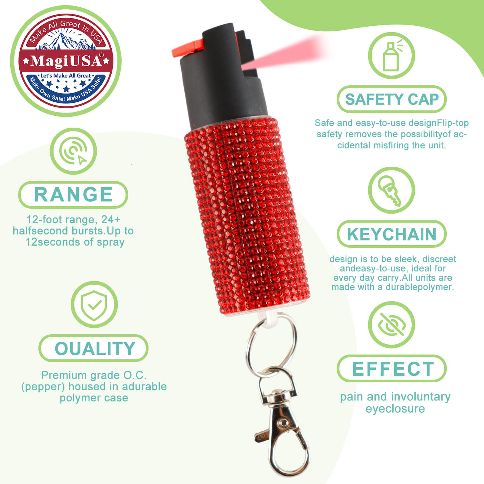 MagiUSA recently launched a new fashion collection of self-defense devices. The red bling-bling pepper spray keychain set is designed for the daily use of vulnerable groups.
